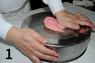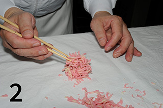 1. 着色した白餡を漉し網にかけてそぼろを作る。 2. 餡玉に竹箸でそぼろをつける。