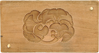 下は、蝶の意匠で「花の友」という名の木型。紀州徳川家の御用菓子屋であった和歌山の総本家駿河屋のものです。同店には十代藩主徳川治宝お好みの菓子が多数伝わっており(註1)、この木型にも、治宝のお好みであることを示す「西浜様御好」(註2)と、「天保十四年卯十月」の書き入れがあります。