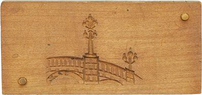 「神徳」は銀杏の葉と実を映したもの。丸い実を巻き込むように葉を重ねたデザインはため息がでるほどの優美さです。もう一つは、ガス燈が立つ日本橋を表したモダンな意匠。江戸時代の木造の橋がアーチ型の石橋に架け替えられたのは明治四十四年(一九一一)のこと。木型は大正時代以降に作られたものでしょう。日本橋界隈の菓子屋などから受けた注文で制作されたものだったかもしれませんね。