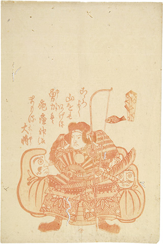 上の菓子袋は、江戸時代に流行った疱瘡(天然痘)の見舞い用に使われたもの。病気や災いを祓う色とされる、赤一色で刷られています。いかめしい顔つきで立っているのは、平安時代、弓の名手として知られた武将・源為朝です。疱瘡の神を追い払う力があると信じられていました。背後を固める達磨たちにも、「病床からの起き上がり」の意が込められています。横を向いていたり、為朝の腕と刀の間から顔を覗かせていたりと、どこかユーモラスでもあります。